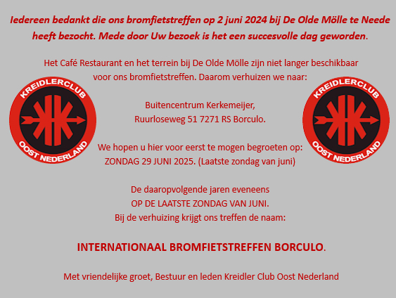De Kreidler fans zijn deze zondag trouwens voor het laatst bij De Olde Mölle, dat een andere bestemming krijgt. Peter Schoenmakers (evenementen commissie van de KCON): Volgend jaar vindt het bromfietstreffen daarom plaats bij buitencentrum Kerkemeijer in Borculo.