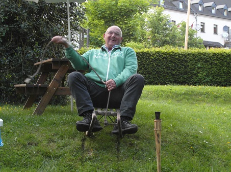 Daarna even nijdig in de klim naar het 3-landenpunt. In Oberhausen een bakkie met aardbeientaart gedaan. Harry Rouwhof vond daar een masker in de tuin van de buren waardooor hij ons natuurlijk in schaterbui kreeg.