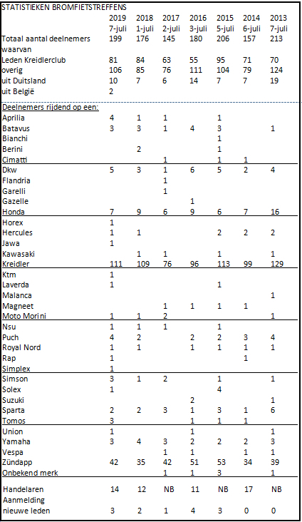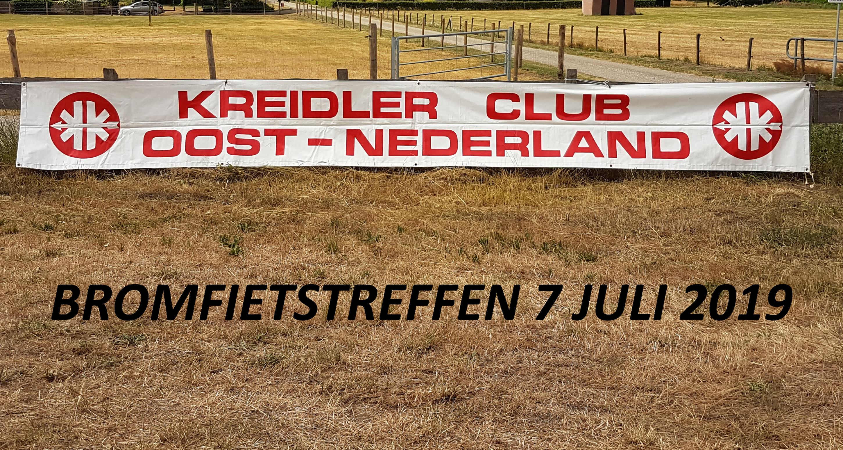 Zondag 7 juli was het weer zover: het internationale bromfietstreffen van onze club. Dit jaar voor de 29e keer. De voorbereidingen werden zaterdag 6 juli getroffen met behulp van vrijwilligers. Dat voorbereiden bestaat o.m. uit het belijnen van het terrein met lint, het opzetten van tenten voor de binnenkomst, muziek en inschrijving en het uitzetten van de route. Voor de route wordt systeem van vierkantje, pijltje, rondje toegepast. Hierbij is het vierkantje linksaf, het pijltje spreekt voor zich: de aangegeven richting volgen en het rondje rechtsaf. (Ezelsbruggetje: Rondje Rechts). Toch zijn er altijd nog mensen die er in het begin niets van snappen. Het mooie van dit systeem is dat je de route met een groep maar ook alleen kunt rijden. Omdat vorig jaar de indeling van het terrein goed is bevallen, was het ook nu weer op dezelfde manier ingedeeld. Ook het weer was goed, weliswaar bewolkt maar met 15-20 graden was het goed te doen. Overigens viel er geloof ik toch nog een klein buitje. Ons clublid Harry Markerink was de organisator van een stand met als thema Kreidler Mustang. Langzamerhand werd het drukker, ook op de onderdelenmarkt.Er waren 14 handelaren en er was weer van alles te koop. Veel onderdelen maar ook complete brommers wisselden van eigenaar. Ondertussen heb ik een paar rondjes gemaakt tussen de bromfietsen door en zo hier en daar een plaatje geschoten van de brommers en motoren. Uiteindelijk waren er 199 deelnemers. Om ongeveer 11.45 uur gaf onze voorzitter het startsein en kon iedereen op eigen gelegenheid aan de toertocht beginnen. In grote lijnen verliep de rit door en of langs de volgende plaatsen/buurtschappen: Start op het terrein in Neede dan Lochuizen-Markvelde-Bentelerbeek-over het Twentekanaal -Ambt Delden-Enter-Elzen-Goor-Stokkum-Twentekanaal over-Diepenheim-Gelselaar-Twentekanaal over-Stokkum-weer Twentekanaal over-Nettelhorst-Gelselaar-Noorddijk-en dan naar Neede terug naar het terrein van het bromfietstreffen. De complete route staat aan het eind van dit verslag en kun je downloaden Om ongeveer half drie was ik weer terug op het terrein en heb ik de bonnen ingeleverd voor een warme hap en aandenken. Dit jaar een vaantje. We kijken uit naar volgend jaar 5 juli het treffen wordt dan voor de 30e keer georganiseerd.