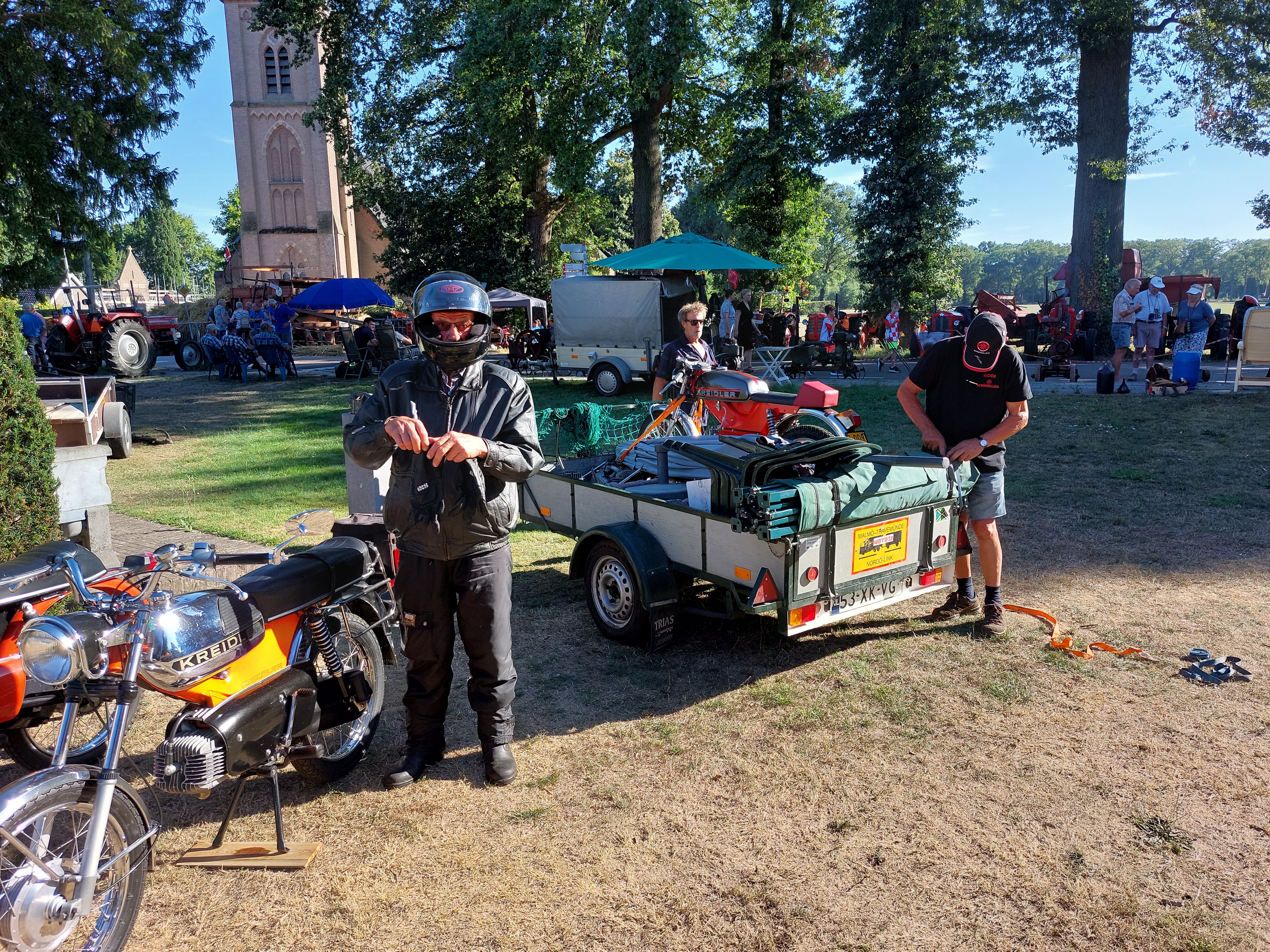 De Reurlse Zommerdagen zijn een vijfdaags evenement met afwisselend muziek, dans, een oecumenische kerkdienst, een brandweermiddag voor de jeugd, een boerderijenfietstocht, een korenavond, een grote braderie, internationale folklore en een oldtimershow van tractoren, werktuigen, stationaire motoren en sinds een aantal jaren ook bromfietsen, speciaal Kreidler. Genoeg te doen dus. De organisatie van de Zommerdagen heeft Peter Schoenmakers een aantal jaren geleden gevraagd of de KCON ook medewerking aan het evenement kon verlenen. Dat is dus gelukt. Peter is al enkele jaren de organisator van het Kreidler gebeuren op de Reurlse Zommerdagen. Ik ben er dit jaar ook naar toe geweest. Het weer was uitstekend, zeer zonnig en warm om niet te zeggen heet. De aanvangstijd was zo rond 12.00 uur. Om 11.00 uur ben ik vertrokken. Na anderhalve km rij ik een fietstunneltje bij Nijverdal uit: Halt politie. Ik denk, wat nou weer. Maar het was een storm in een glas water. Ze visten naar jeugd met opgevoerde scooters en brommers. Ik moest mijn rij en kentekenbewijs laten zien en een keer aan het gas draaien. Oom agent: Het lijkt me dat alles in orde is. (Dat is ook zo). Een goede reis kreeg ik toegewenst na zijn vraag waar ik naar toe ging. Om 12.15 was ik in Ruurlo. Na de brommer gestald te hebben kreeg ik consumptie bonnen aangeboden als blijk van waardering voor de medewerking. Op het terrein was onze promotie stand ook weer ingericht met diverse attributen: opengewerkte motorblokken, te koop aangeboden onderdelen en kleding enz. van onze promo shop.