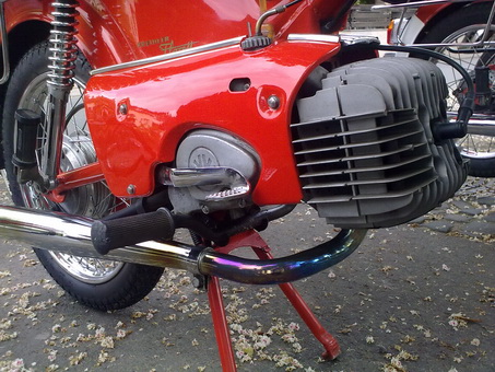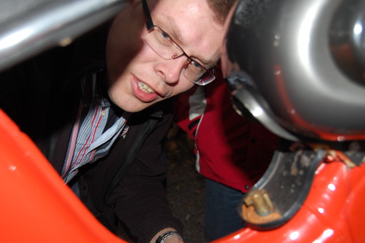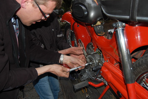 Van de groep die voor ons is wezen toeren bleek toch een Kreidler eitank niet in optimale conditie te zijn. Bij Johan Bok sprong de vonk niet goed over. Nu heeft hij daar normaal nooit last van en vonkt het altijd wel ergens bij Johan, maar dit keer was de ontsteking van zijn super-5 niet in orde; een doorslaande spoel. Na de avondmaaltijd werd dan ook de super van Johan, buiten op een tafel gezet en is met zo’n 20 man een andere ontsteking geplaatst. Gelukkig was naast de 20 monteurs ook Thomas aanwezig en was de super in no-time weer gefixed.