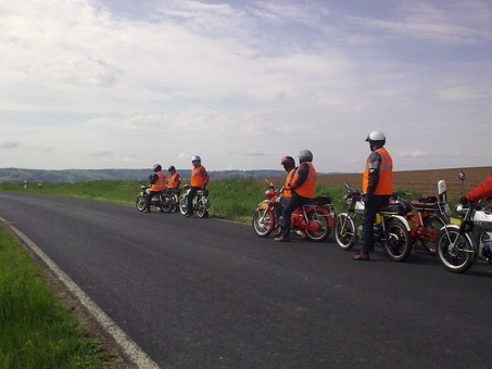 Met 5 personen hebben wij, in plaats van terraswerk, nog een ritje gemaakt. Mijn buffeltank had t.o.v. de 3 andere supers en een RS, het minste trekvermogen. Bergop zat ik dan ook achteraan, maar bergaf kon ik weer veel goed maken. De snelheid lag een stukje hoger dan de rit eerder op de dag. Via kleine weggetjes en ook nog een bospad de berg op, kwamen wij toch weer op wat meer bereden paden. Vanaf de bergtoppen heb je een schitterend uitzicht over de bossen, akkers, weilanden en de fel-gele koolzaadvelden. Vooral deze tocht leek op een grote achtbaan, echt speelgoed voor mannen die geen motor kunnen betalen of mogen berijden. Na afloop bleek de bocht en uitlaat van de Kreidler RS van Alfons Assink wel erg blauw, paars, rood en geel te zijn geworden. Ontsteking te laat. Ook dat is weer opgelost dankzij de aanwezige techneuten.