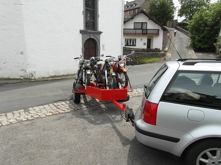 Weer verder richting Lutzkampen, Harspelt, Roscheid en Reiff. Daar raakten de laatste 6 personen de aansluiting kwijt door de vele bochten in dit traject. Maar onze vaste achterrijder Jan de Groot raakte niet in paniek en leidde die groep weer terug naar Dasburg, waar ze dus eerder aankwamen dan de rest die nog even via Reipeldingen waren gereden. Al met al een prachtige rit door een zeer indrukwekkend landschap. Ongelofelijk steile hellingen waar soms de naar beneden gevallen boomstammen tussen de bomen langs de weg staken. En als je naar rechts keek zag je niet de helling, alleen maar ergens in de diepte woest kolkende rivier. Om bang van te worden als plattelander zoals ik zelf. Om 12:15 waren we weer terug bij het hotel en hebben we de Kreidlers op de aanhangers geladen.
