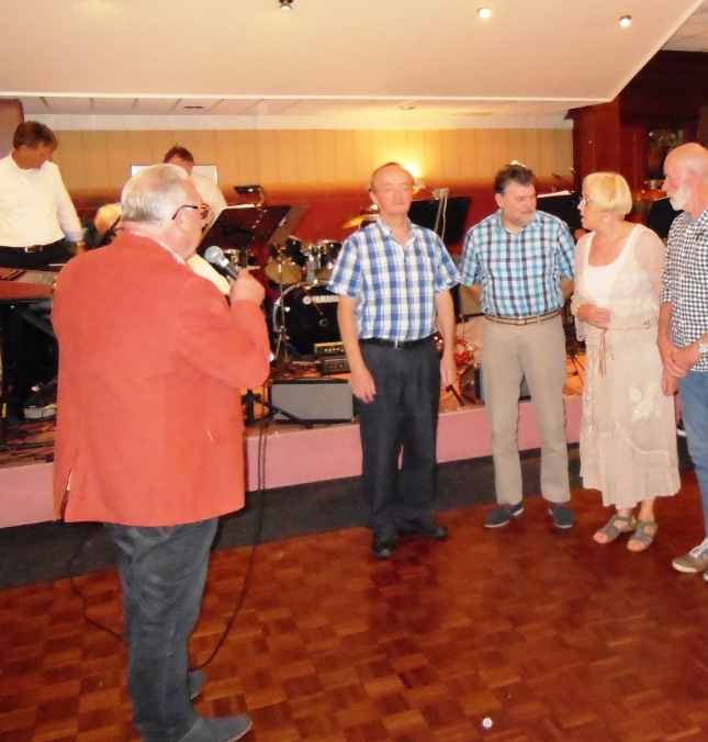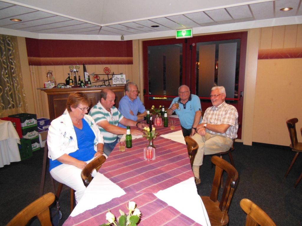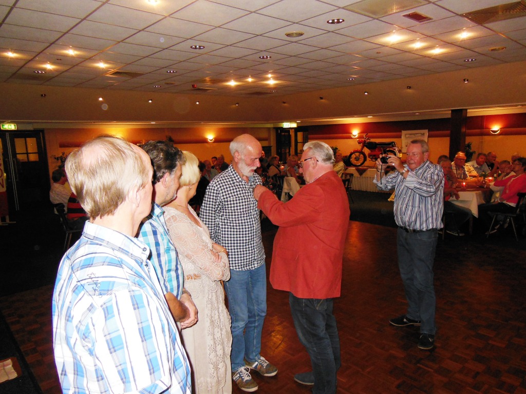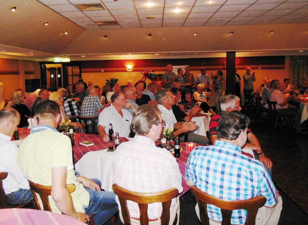 Op 23 augustus 2015 was het precies 25 jaar geleden dat onze club officieel werd opgericht Ter gelegenheid van dit heugelijk feit is er door een door het bestuur aangestelde feestcommissie e.e.a. georganiseerd. Als eerste is er door de commissie veel georganiseerd tijdens het bromfietstreffen op 5 juli. Op de exacte oprichtings datum was er een prachtige tourrit uit gezet. En als laatste evenement tijdens dit jubileumjaar was er op 29 augustus een feestavond bij de Olde Mölle te Neede. Jammer dat het volledige bestuur niet aanwezig kon zijn. Wat ook jammer was, was de magere opkomst van de leden. In z’n totaliteit waren er ca 80 mensen inclusief partners en enkele sponsoren. Dat viel erg tegen. Van de aanwezige leden waren er ca 35 met partner. Dus in totaal hadden zich 80-35 = ca45 leden opgegeven. Op een ledenaantal van 315 is dit (om niet te zeggen bar) erg weinig. Toch waren er ook mensen die van ver gekomen waren ondermeer uit Arnhem , Noord Holland, Joure en uit Veenhuizen in Drenthe. De gezelligheid was er echter niet minder om. De muziek speelde nummers uit de 60 en 70er jaren,schitterend. Al hoorde ik zo hier en daar er zit geen Beatles of Rolling Stones bij. Persoonlijk had ik enkele Nederlandstalige nummers uit die tijd ook wel mooi gevonden. Dit blijf je houden, smaken verschillen nou eenmaal. Wat mijns inziens bij iedereen in de smaak viel was de demonstratie van de Rock and Roll groep. Het was een wervelende show. De avond werd op een uitstekende manier aan elkaar gepraat door ceremoniemeester Ben Dorenbusch. Hij had ook de taak om de aanwezige bestuursleden van het eerste uur en die nog lid zijn van onze club in het zonnetje te zetten en een speldje op te spelden met de tekst Kreidler Club Oost Nederland 25 Jaar Lid. Dit waren de heren Bok , Beumer en Libbers. Ook een speldje kregen de heren Wilderink , Hekman en Leferink. Deze waren ,,gewoon,,25 jaar lid. Er schenen echter nog enkele leden aanwezig te zijn die ook 25 jaar lid waren maar geen speldje hebben gekregen. Onze secretaris heeft toegezegd dit uit te zoeken.In de toekomst zullen leden die 25 jaar lid zijn met de nieuwjaarsreceptie worden gehuldigd. Ook de inwendige mens is niet vergeten er was een royaal hapjes/koud en warm buffet. Het smaakte voortreffelijk. Door dat er met het bromfietstreffen met de verloting niet alle prijzen eruit waren gegaan, werden op deze avond enveloppen uitgedeeld met hierin al dan niet een bonnetje voor een prijs. Ikzelf kon me gelukkig prijzen met een mini fietsbel. Aan alles komt een eind , dus ook aan deze feestavond. Om 24.00 uur was het afgelopen (precies zoals in de 60 en 70er jaren). Ik vond het een geslaagde avond!! Op naar de volgende 25 jaar………..alhoewel? Hoe oud hopen we dan te zijn ???
