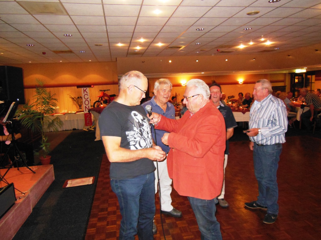 Mannie Libbers , Gerhard Beumer en Johan Bok krijgen een speldje 25 jaar lid Kreidler Club Oost Nederland. Zij waren medeoprichter van onze club en nog steeds Lid