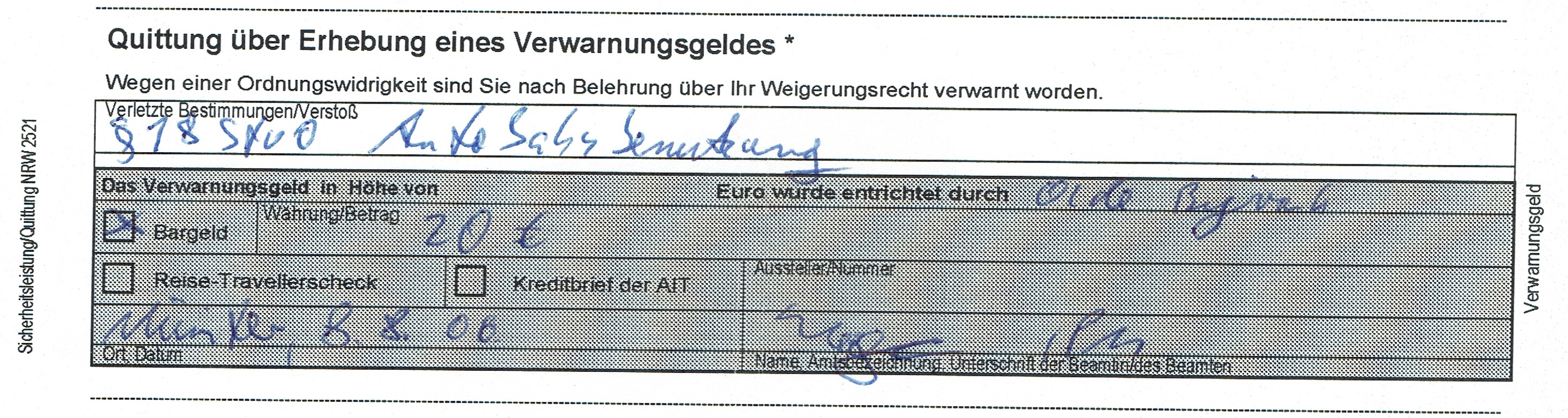 Ze vertelden me dat ik een verwarnung (=waarschuwing) kreeg van 20 euro. Of ik dat contant wilde betalen.