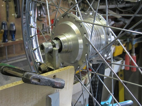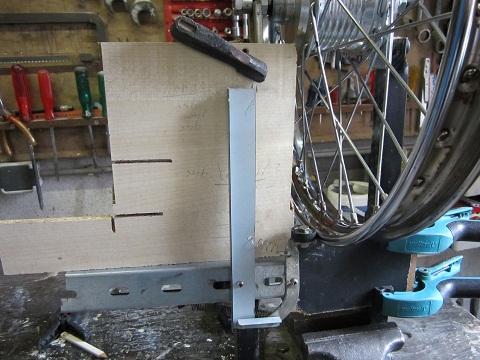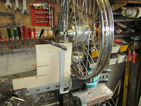 Voor het kunnen werken aan het wiel heb ik een verstelbare vork gemaakt van 2 kokerprofieltjes met een draadstang voor het op afstand stellen voor de naafbreedte.