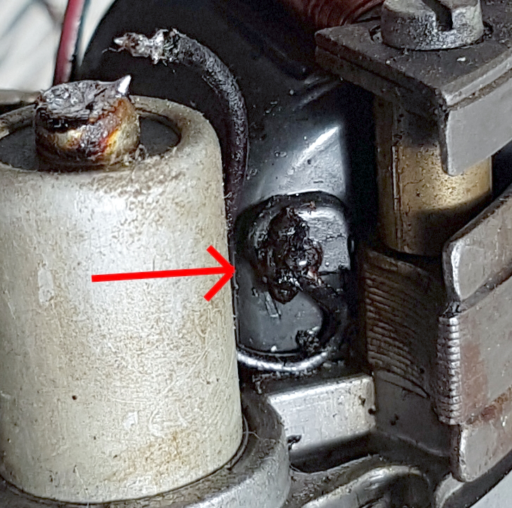 Er zitten ,,teer,, bolletjes bij het draadje dat van de ontstekingsspoel naar de condensator loopt.