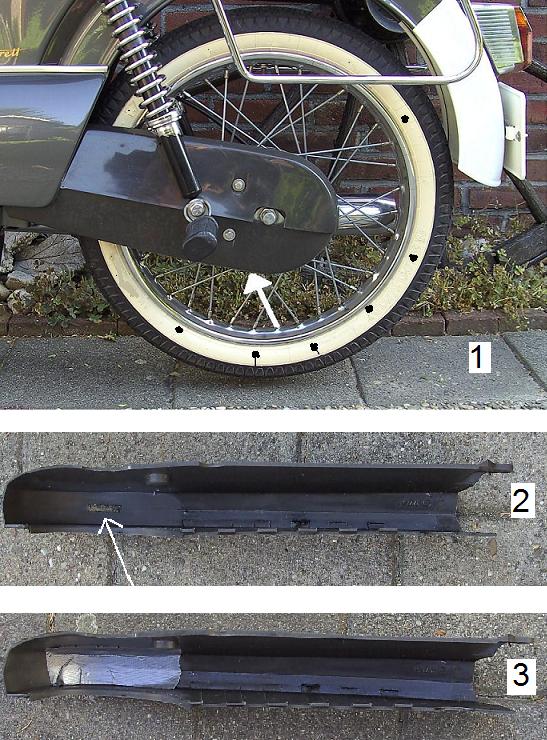 Bij de plastik ketting kasten van Kreidlers met het bouwjaar vanaf 1967 zit er een sleuf in de onderste ketting kast ter hoogte van het achter tandwiel. (Witte pijl)
