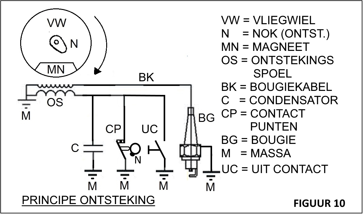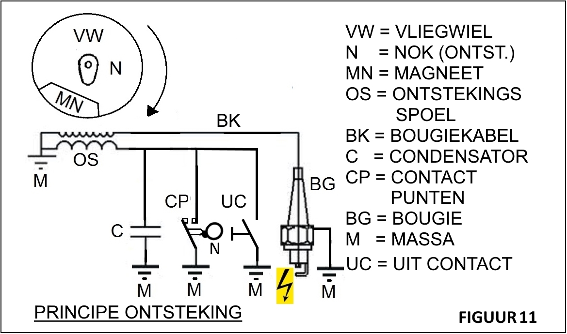 Anders wordt op het moment wanneer de nok in het vliegwiel de contactpunten CP opent zie figuur 11. Dit is exact het moment wanneer de bougie moet vonken.
